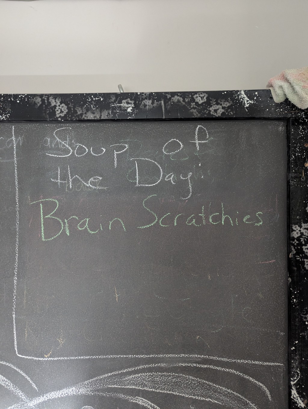 I have this section of the chalkboard in my house where I write a rather existential “Soup of the Day.” I started doing it on my whiteboard at Burning Man last year, and continued for several months after getting back to the default world. Well, now I want to revive it on here. Consider this a sort of “not worth of a full length post” post.